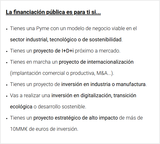 Financiación Pública La financiación pública puede ser el impulso que tu empresa necesita en este 2025, donde existen más de 25.000 millones de euros disponibles para invertir. Te ayudaremos a conseguirla. Solicita tu informe GRATUITO He leído y acepto la Política de privacidad